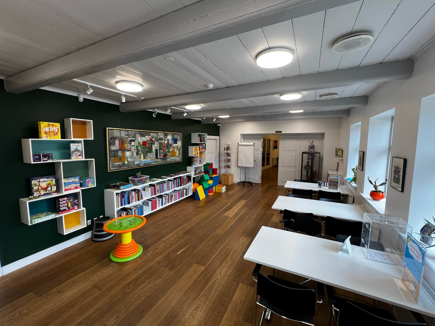 Bibliotekstuen er indrettet med stole og borde til 12 personer, men fungerer også som en del af biblioteket med brætspil, faglitteratur og magasiner.