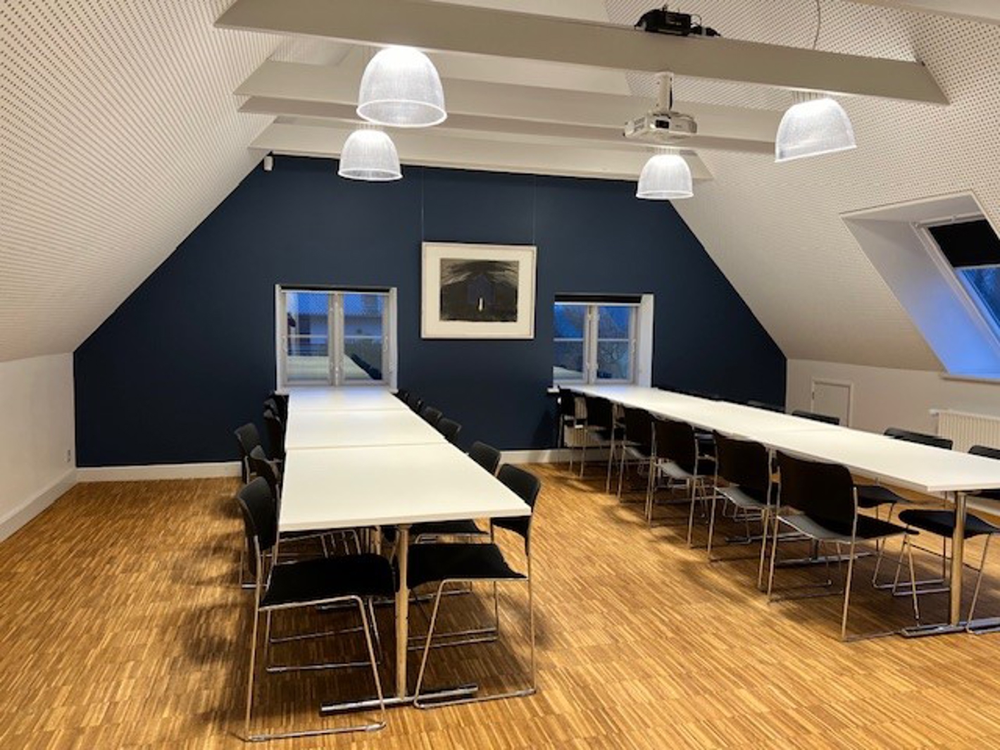 Lillesal ligger på 1. sal og har langborde med plads til 20 personer.