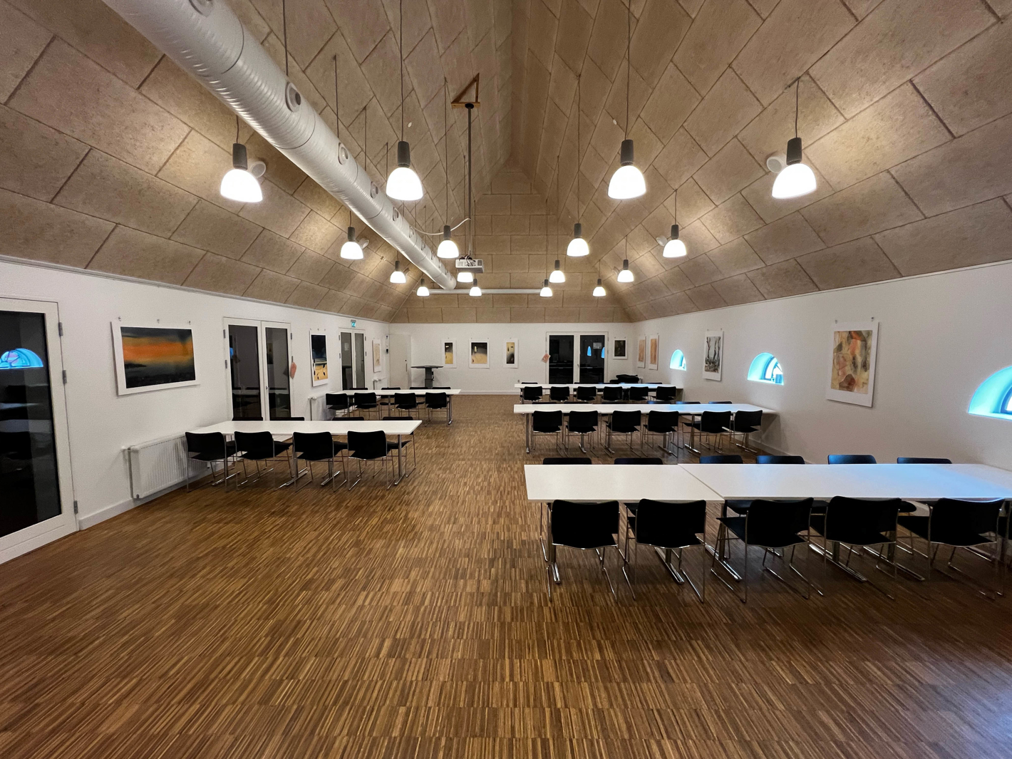Der er ekstra borde og stole i lokalet, så grundopstillingen kan udvides op til i alt 100 personer.